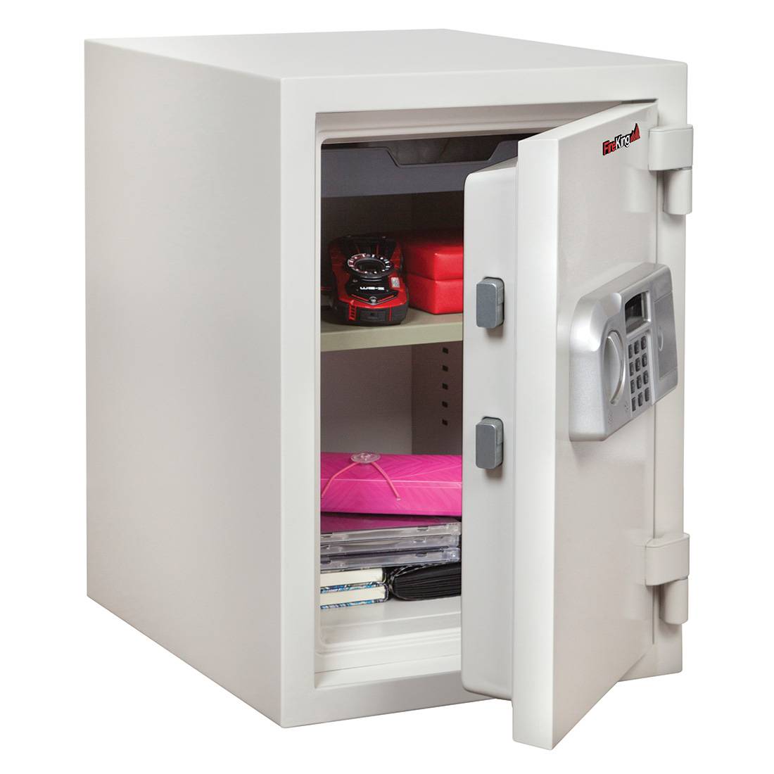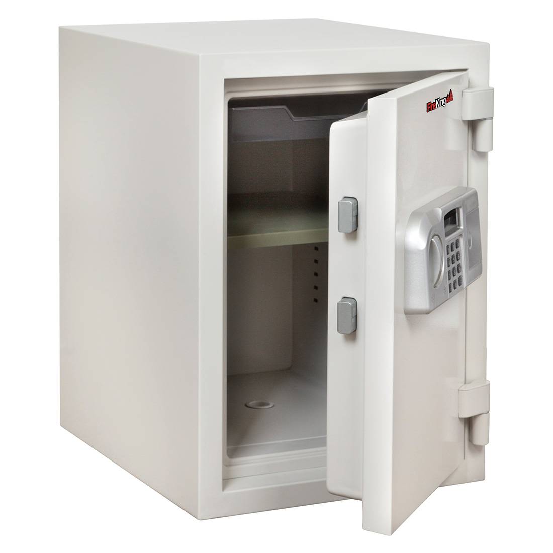 In addition to its one hour fire rating, the FireKing KF1509-1WHE One Hour Fire Safe is also water-resistant. Its sturdy all-steel construction has a textured finish, and it comes with a tray and an adjustable shelf. The electronic lock ensures easy access, while the two deadbolts and two live bolts offer extra security.